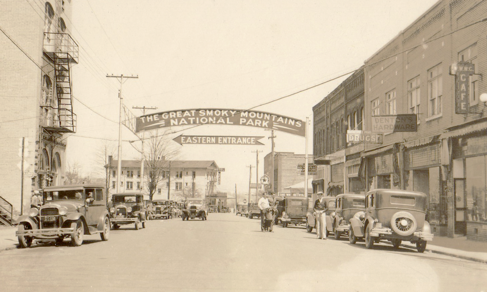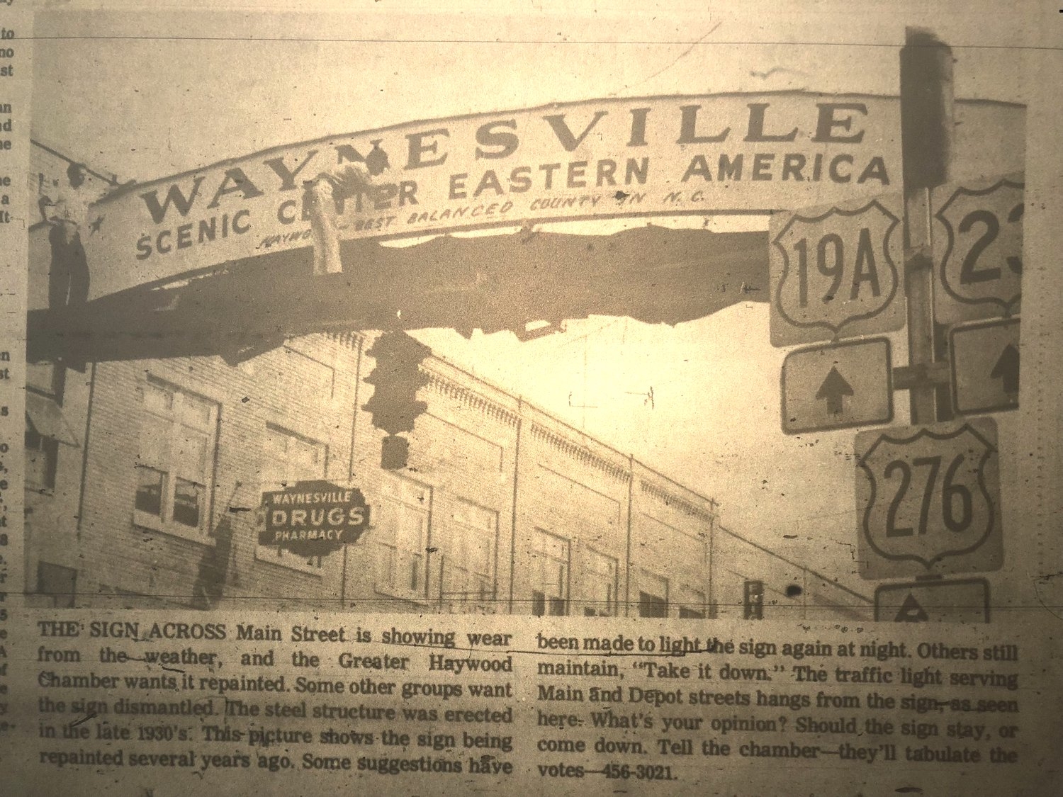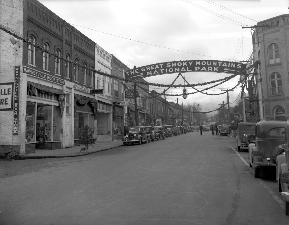 On April 1, 1933, as a way to celebrate the enthusiasm surrounding the development of the Great Smoky Mountains National Park, the Town of Waynesville Board of Aldermen voted to donate $50 to help pay for the construction of of a “Parkway Sign at the corner of Depot and Main Streets” in Downtown Waynesville, North Carolina.