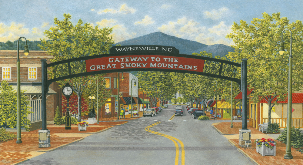 Waynesville artist Teresa Pennington, known for her incredibly detailed colored pencil drawings of the Biltmore mansion, has created a rendering of the proposed Arch in its downtown setting. She is offering prints of "Gateway Arch" as a means to help the fundraising effort.